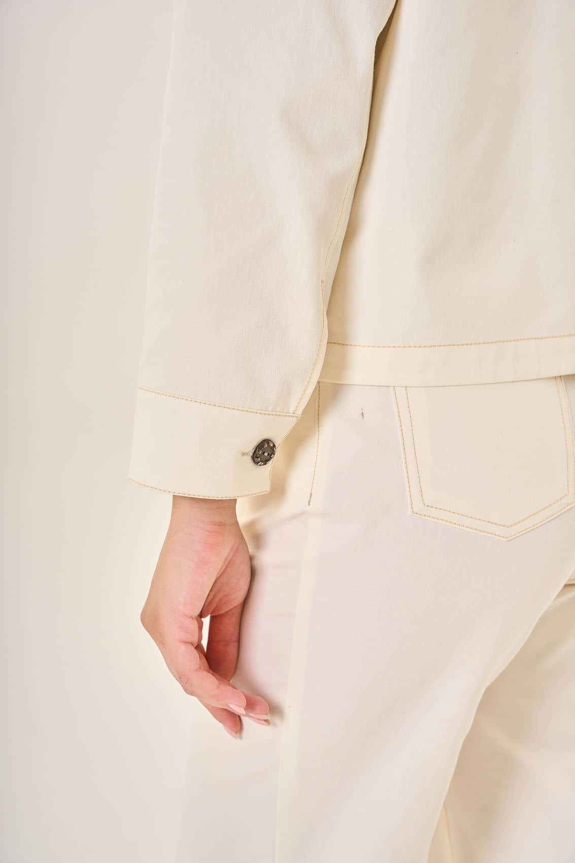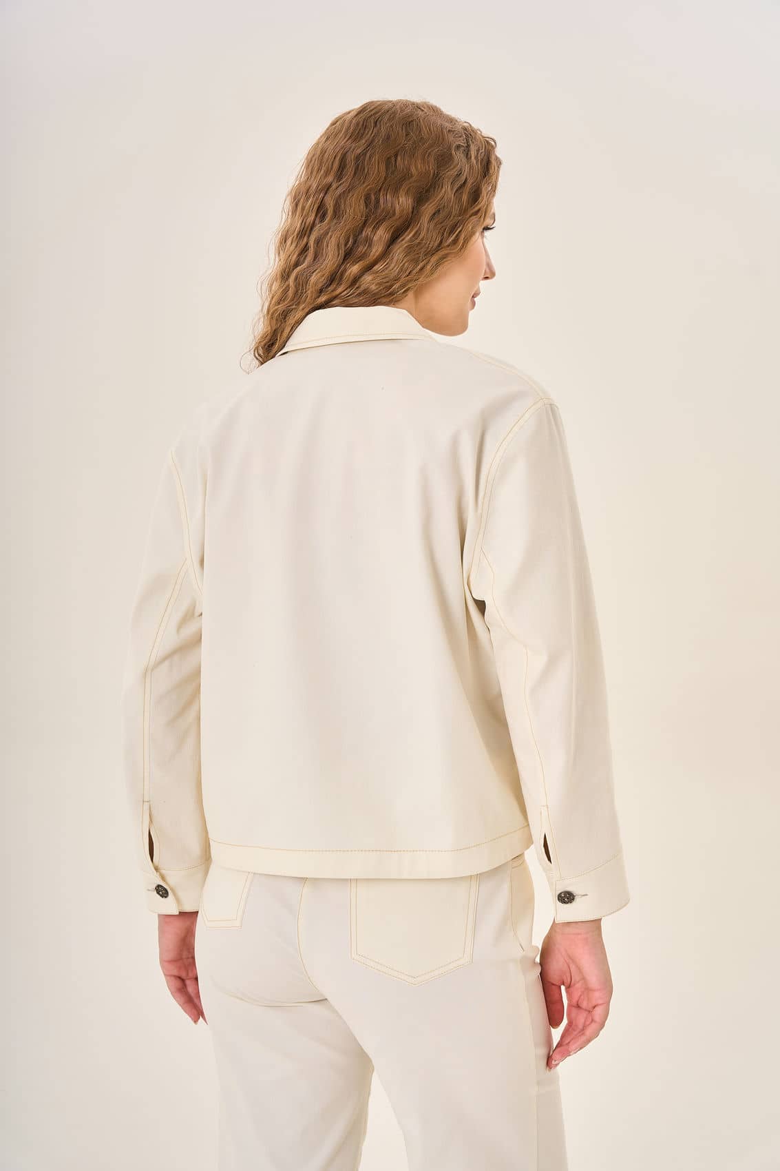 Жакет с классическим отложным воротником и длинными рукавами демонстрирует сдержанный шик. Пяти тёмных пуговиц достаточно, чтобы подчеркнуть строгий силуэт и добавить аккуратности общему виду. Пару накладных карманов впереди удачно завершают композицию, обеспечивая функциональность и дополняя образ лаконичностью деталей. Прочный и качественный материал жакета гарантирует комфорт даже в самую переменчивую погоду.