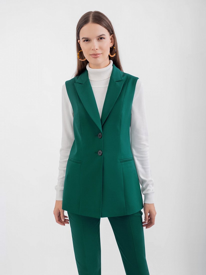 Жилет из костюмной ткани на подкладке полуприлегающего силуэта с v-образным вырезом, английским воротником и застежкой спереди на пуговицу. Спереди рельефы и карманы листочки. Сзади шлица.